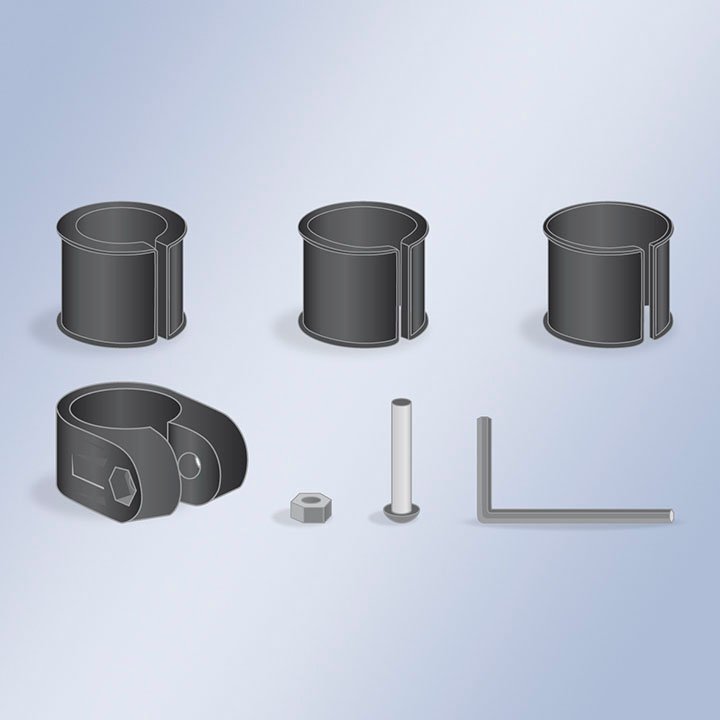 2 clamps of 25 mm, 2 adapters of: 19-21-22 mm, 2 screw and 1 allen key.
