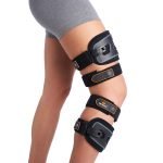 The foam fabric protections are breathable and can be easily removed for washing. The connection between the joint and the thigh piece features a hinge that enables varus or valgus axial adjustment to improve knee load distribution efficiency. It features a rapid, secure and easy to handle closure system that enables comfortable and efficient fitting and removal of the brace.