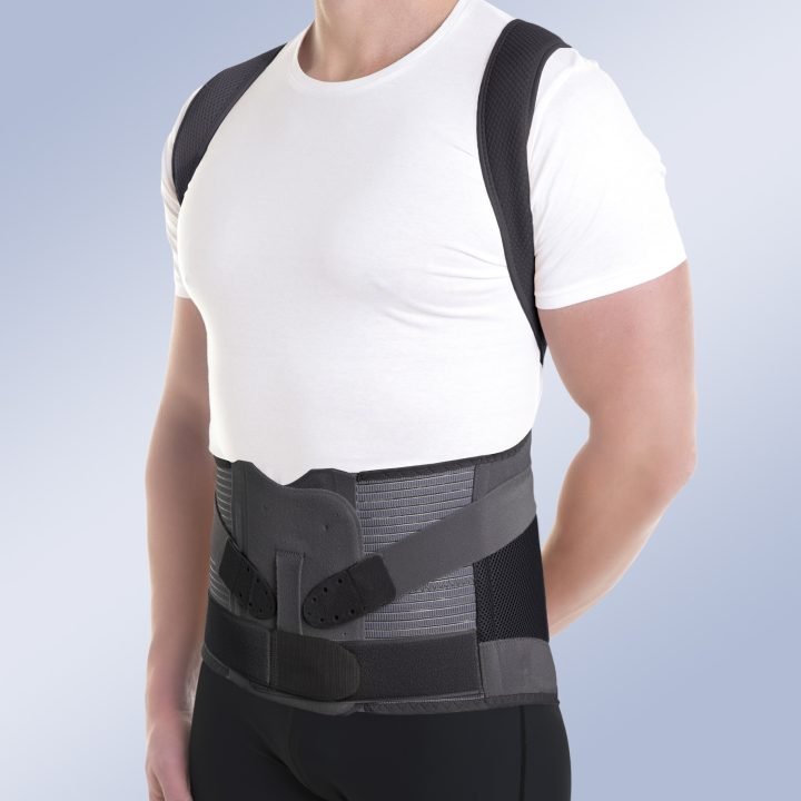 The lumbar and dorsal elements are made from breathable honeycomb fabric with terrycloth interior. The dorsal element features preformed malleable aluminium splints and adjustable semi-elastic straps in a soft padded fabric to fit the underarm area and achieve optimum comfort. The lumbosacral element features a belt with a lumbar structure and rear stays. On their inner edge, from where they start on the dorsal side up to the shoulders, the straps are made with a more rigid edging to ensure a better fit for the dorsal element, thus enabling greater elasticity in the underarm area.