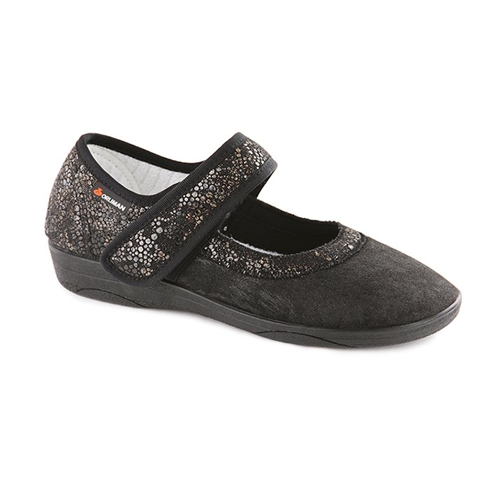 Very comfortable shoe with wide opening which can be worn with an orthosis. Polyamide closure system featuring a long adjustable strap to adapt to swollen insteps. Removable insole that allows the use of an orthopaedic insole. Double-acting material for a stylish and feminine shoe. Water resistant. Slightly elastic outer fabric for better adaptation to toe