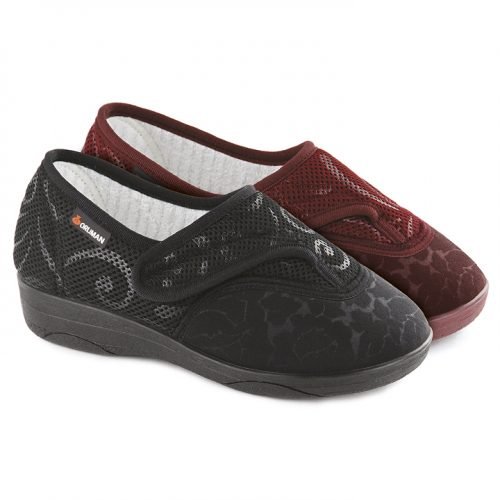 Very comfortable shoe for sensitive feet. No seams in the forefoot, ideal for operated feet. Cushioned closing system that adapts to all the widths of the feet. Water resistant. Slightly elastic outer fabric for better adaptation. Two closing systems: It has two locking systems, one with a locking tongue and the other on the back, for a complete opening. Removable template: Allows the use of an orthopedic insole. Ergonomic tongue: Fits the instep of the foot.